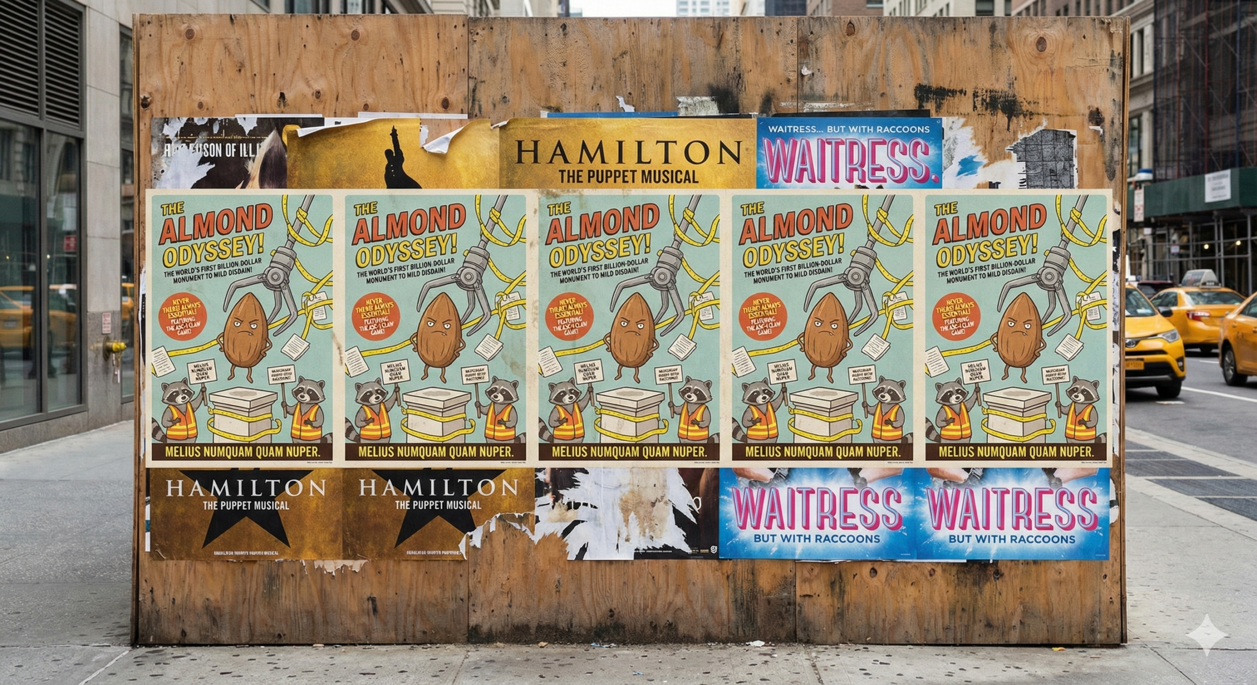 1. The “Expected” Almond Exhibit The grand rotunda of the monument. In the center sits an empty, ornate stone pedestal. In front of it, a hand-drawn sign features a grumpy cartoon almond with the message: “Hey folks! ‘Burrow-Cratic’ Red Tape means I couldn’t be here today.” In the foreground, raccoons wearing tiny, high-visibility safety vests scurry around the base.