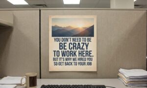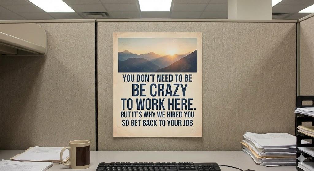 4. The Back Office Inspirational Poster A stylistic office interior featuring a framed “inspirational” poster on the wall. The text reads: “You don’t need to be crazy to work here. But it’s why we hired you so get back to your job.” The background shows the slightly cluttered, professional workspace of the IAMS team, complete with EpiPen storage and chartreuse-colored paperwork.