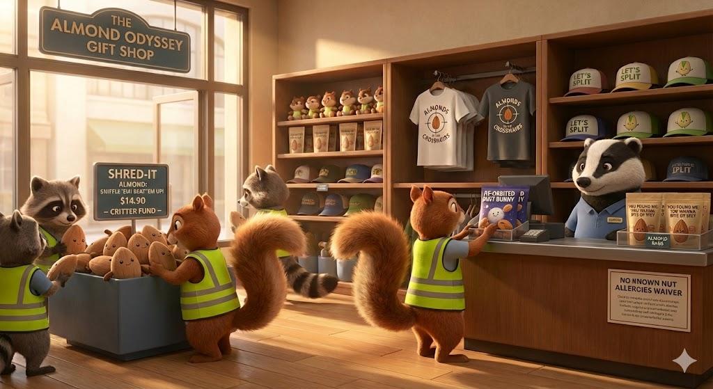 2. The Museum Gift Shop The park’s gift shop. The shelves are filled with quirky merchandise, but the centerpiece is a large wooden bin overflowing with “Shred-It Almond” plushies—tactile, bean-bag-like stuffed almonds designed for therapeutic destruction. The shop is populated by various plush-textured animals browsing the “Where’s the Nut” apparel.