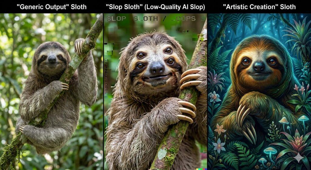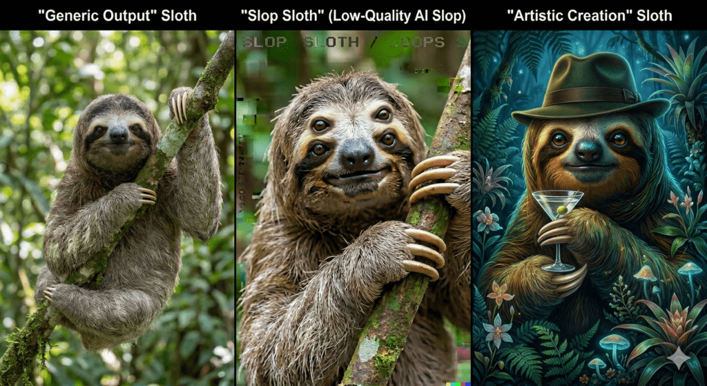 1) Prompt: “generate image. split screen 3 panels. left: a sloth. (representing generic output”. middle: a slop sloth. right: an exquisite image of a sloth (representing art)”